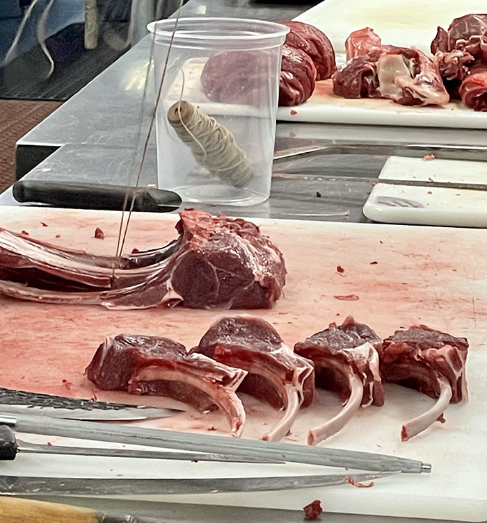Late in class, she and students used a mallet and cleaver, then twine and fine knives to shape ribs into fancy “Frenched” venison “lollies.”