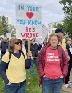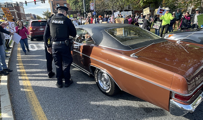 Notably few detractors appeared. Some drove by, raising their fists; one waved a MAGA hat through the sunroof. A Trump flag waved among the City Park crowd, its carrier unhindered so far as I noted.