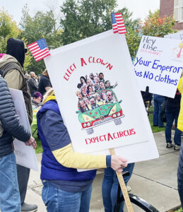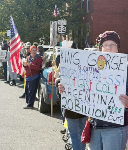 Among the half-dozen speakers, co-organizer Bethany Lawrence said, “The United States of America does not, has not and will never bow to kings. What we’re doing here today is guaranteed in the Constitution. The act of gathering, of speaking truth to power and of assembling peacefully is our American inheritance.”