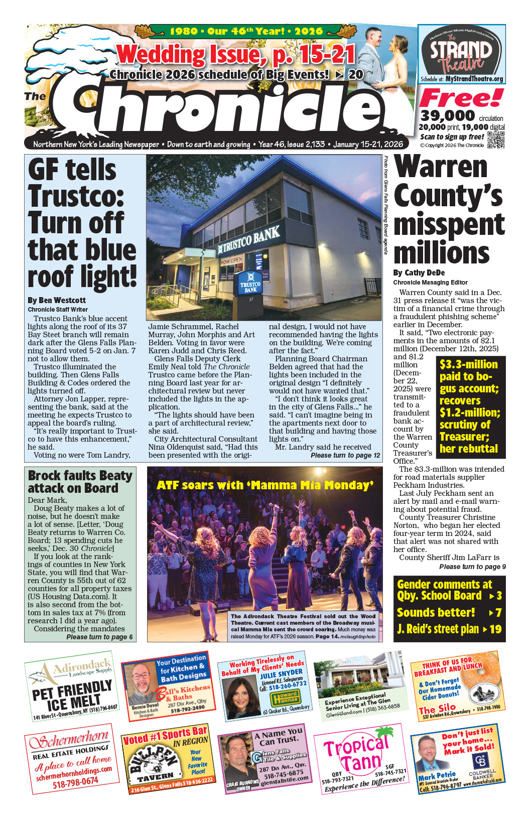 Wedding Issue! Warren County’s misspent millions. Chronicle 2026 schedule of Big Events! GF tells Trustco: Turn off that blue roof light! Public comment gender & bathrooms at Qby. School Board. 36 recipients for 49th South High Marathon Dance. ATF season has Trevor Strader 1-man show. Concerts, comedy, shows… The Chronicle always has the region’s best Arts & Entertainment section!