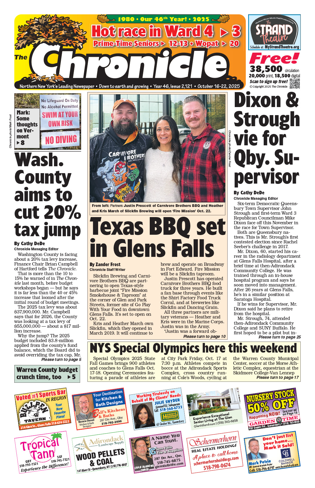 Prime-Time Seniors Issue! Hot race in Ward 4. Tom Wopat interview. Washington County aims to cut 20% tax jump. Texas BBQ set in Glens Falls. Dixon & Strough vie for Qby. Supervisor. NYS Special Olympics here this weekend. Work begins on LG Amphitheater; Groundbreaking. ‘Baskets for Ben’ at Qby VFW 6196 Friday, Oct. 24. Concerts, comedy, shows… The Chronicle always has the region’s best Arts & Entertainment section!
