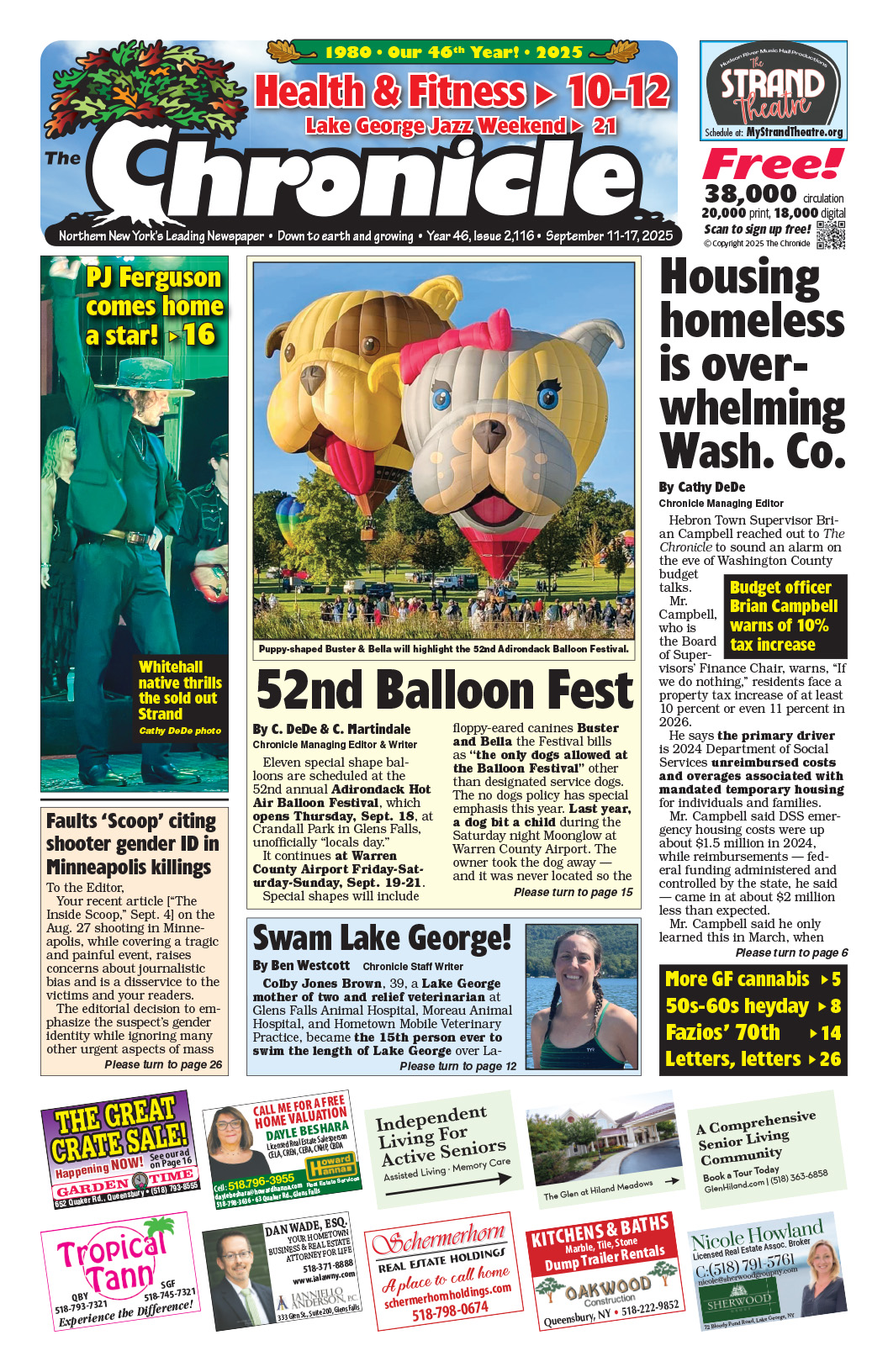 Health & Fitness Quarterly Issue! 52nd Balloon Fest. Lake George Jazz Weekend. PJ Ferguson comes home a star! Housing homeless is overwhelming Wash. Co. Swam Lake George!. Hebron getting new Verizon cell tower, 2 years after Kaylin’s shooting death. GF getting 2nd cannabis dispensary: Windy Hill Wellness at Broad St. plaza. Our area’s 50s-60s heyday. Concerts, comedy, shows… The Chronicle always has the region’s best Arts & Entertainment section!