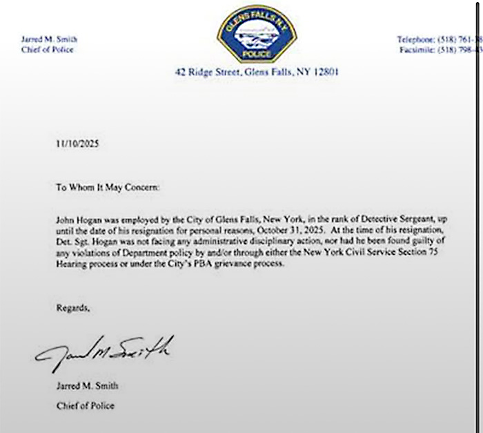 Further intrigue arose when a person purporting to be a relative of Officer Hogan posted on Facebook a purported letter on Glens Falls Police letterhead dated 11/10/25, with the signature of Jarred M. Smith, Chief of Police. It was addressed “To Whom It May Concern.” It said, “John Hogan was employed by the City of Glens Falls, New York, in the rank of Detective Sergeant, up until the date of his resignation for personal reasons, October 31, 2025. At the time of his resignation, Det. Sgt. Hogan was not facing any administrative disciplinary action, nor had he been found guilty of any violations of Department policy by and/or through either the New York Civil Service Section 75 Hearing process or under the City’s PBA grievance process.”