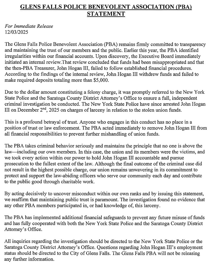 It began, “The City of Glens Falls Police Department had placed GFPD Member John Hogan III on paid administrative leave on July 29th, 2025 in direct relation to alleged misconduct involving his role as the Glens Falls PBA Treasurer.”